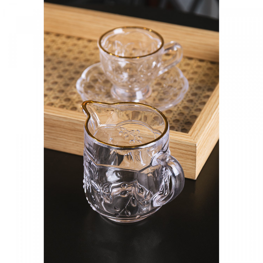 Adicione um toque de delicadeza e sofisticação à sua mesa com a Leiteira New Butterfly da Lyor. Feita em cristal ecológico transparente, com acabamento em fio de ouro e detalhes encantadores de borboletas em relevo, ela transforma o servir em um momento especial. Com capacidade de 200 ml, é ideal tanto para o dia a dia quanto para ocasiões especiais.