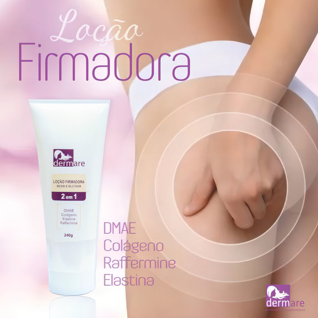 Loção firmadora para seios e glúteos. Dermare 2 em 1 é a opção ideal para ser utilizada no tratamento de flacidez, já que seus ativos estimulam a produção de colágeno.