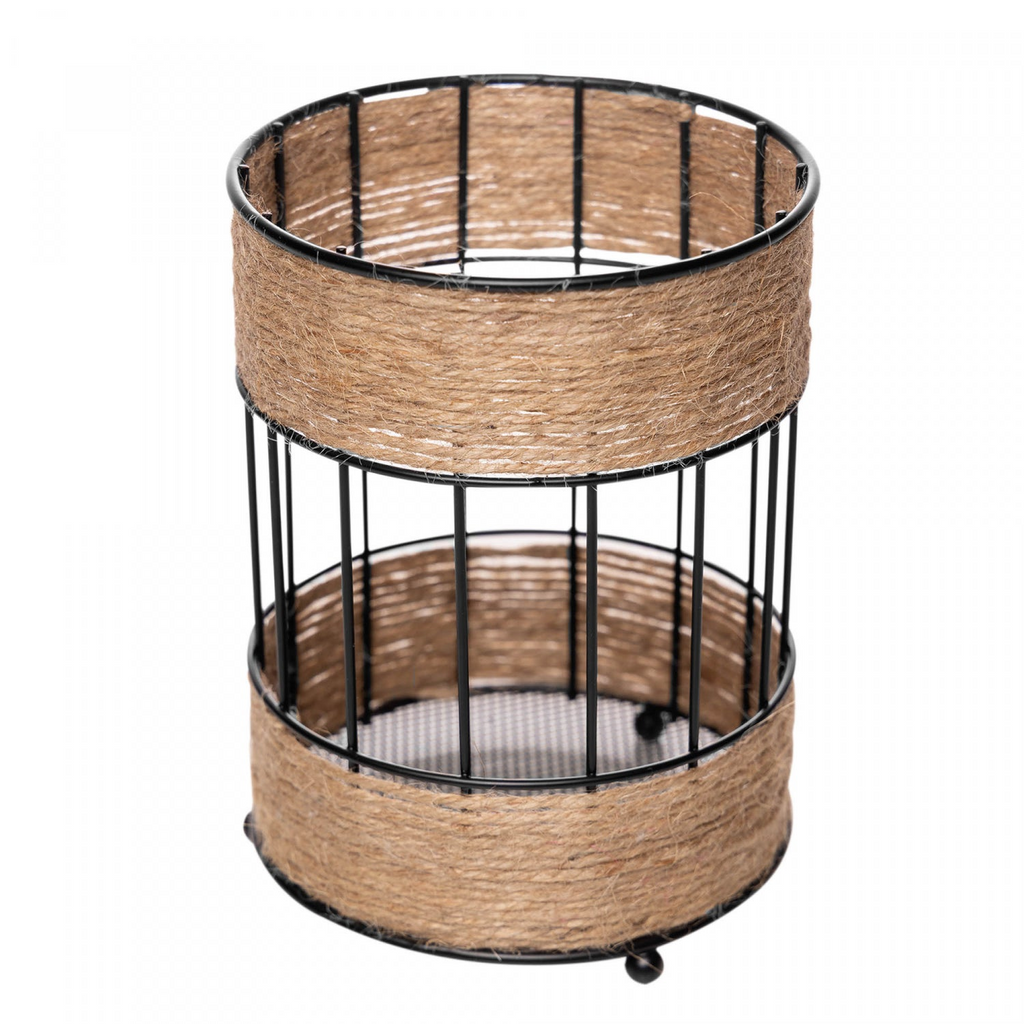 Porta talher sofisticado que une elegância e praticidade para o seu espaço. Com estrutura metálica preta resistente, este suporte apresenta detalhes em barbante que trazem um charme artesanal e moderno. Compacto, ideal para bancadas, mesas ou gavetas, ele mede aproximadamente 12 cm de altura por 16,5 cm de largura — perfeito para organizar seus talheres com estilo sem ocupar muito espaço.